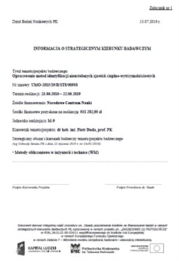 Opracowanie metod identyfikacji nieustalonych zjawisk cieplno-wytrzymałościowych, OPUS 10, NCN, 2015/19/B/ST8/00958, 2016-2019, 931 282 PLN.